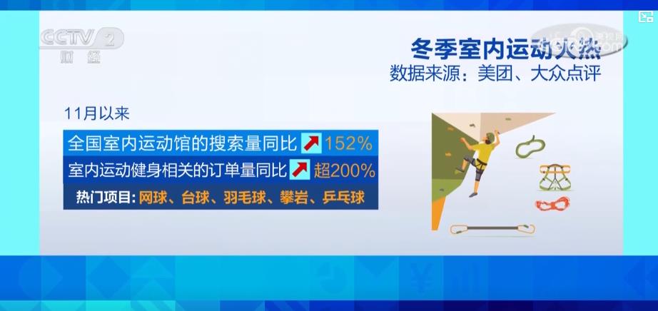 數(shù)據(jù)顯示,11月以來(lái),全國(guó)室內(nèi)運(yùn)動(dòng)館的搜索量同比增長(zhǎng)152%,與室內(nèi)運(yùn)動(dòng)健身相關(guān)的訂單量同比增長(zhǎng)超200%,網(wǎng)球、臺(tái)球、羽毛球、攀巖、乒乓球是其中的熱門項(xiàng)目。