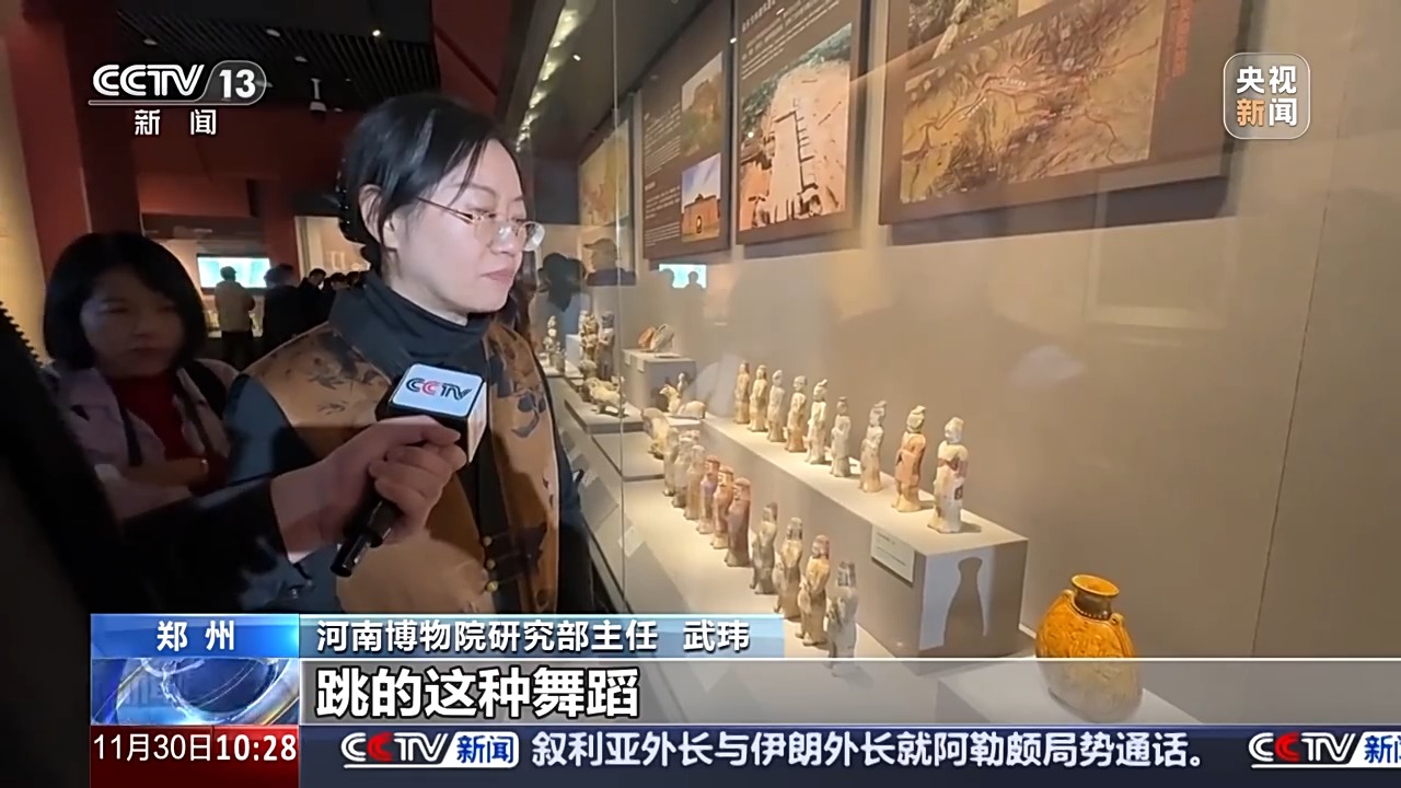 河南博物院研究部主任 武瑋:樂舞者的形象高鼻深目,戴有一種翻帽,穿的是那種圓領或者是翻領的長袍。當時的人稱為胡人的形象,跳的這種舞蹈,包括使用的樂器,可能最主要是來自中亞。