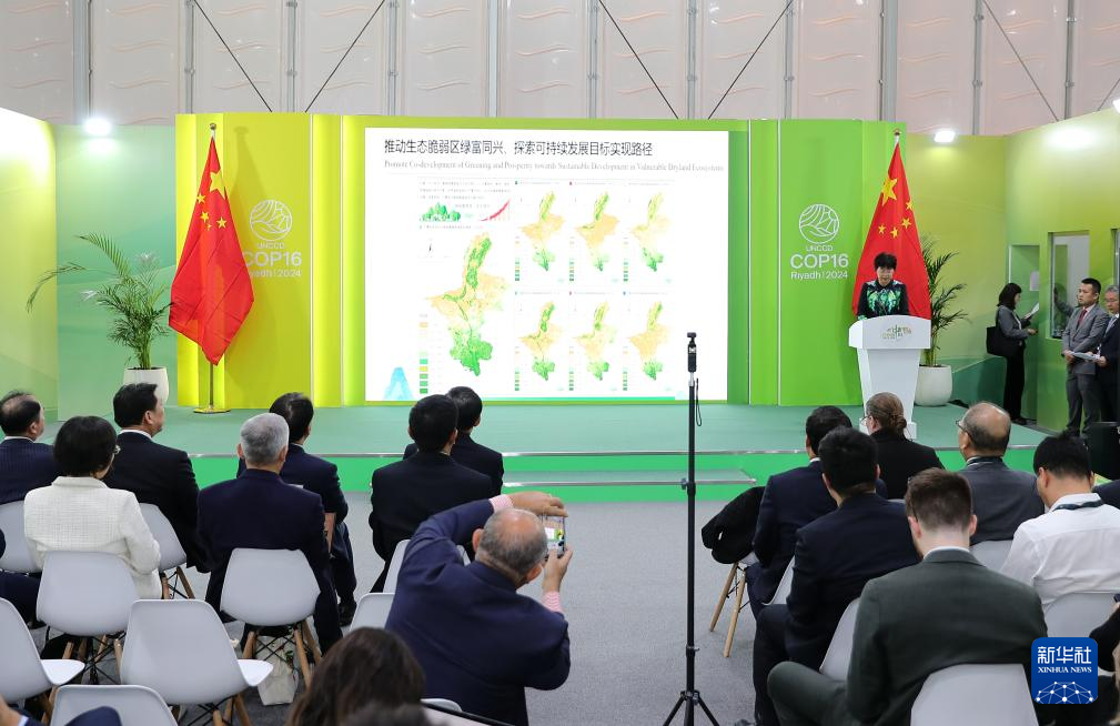 這是12月4日在沙特阿拉伯利雅得《聯(lián)合國防治荒漠化公約》第十六次締約方大會(COP16)中國館拍攝的邊會現(xiàn)場。《聯(lián)合國防治荒漠化公約》第十六次締約方大會(COP16)中國館4日下午舉辦首場邊會,向全球介紹荒漠化防治的“寧夏經(jīng)驗”。新華社記者 王東震 攝
