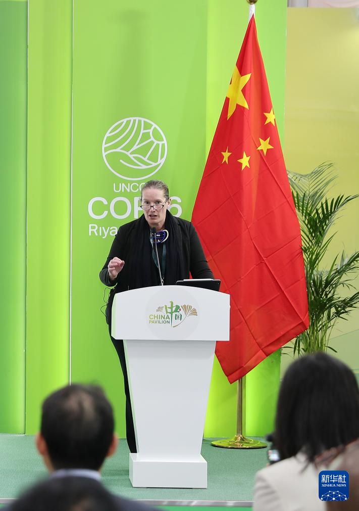 12月4日,在沙特阿拉伯利雅得,世界銀行全球環(huán)境局局長瓦萊麗·希基在《聯(lián)合國防治荒漠化公約》第十六次締約方大會(COP16)中國館舉辦的邊會上發(fā)言。新華社記者 王東震 攝
