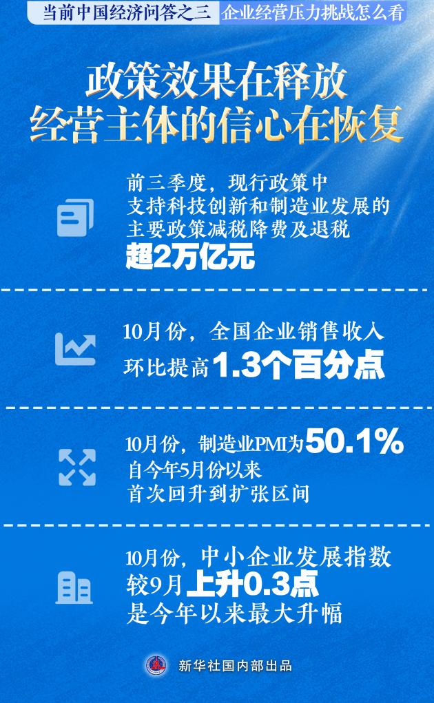 10月份,全國(guó)企業(yè)銷售收入同比增長(zhǎng),環(huán)比提高1.3個(gè)百分點(diǎn);制造業(yè)PMI為50.1%,自今年5月份以來(lái)首次回升到擴(kuò)張區(qū)間;非制造業(yè)商務(wù)活動(dòng)指數(shù)連續(xù)數(shù)月穩(wěn)定在50%左右;中小企業(yè)發(fā)展指數(shù)較9月上升0.3點(diǎn),是今年以來(lái)最大升幅。