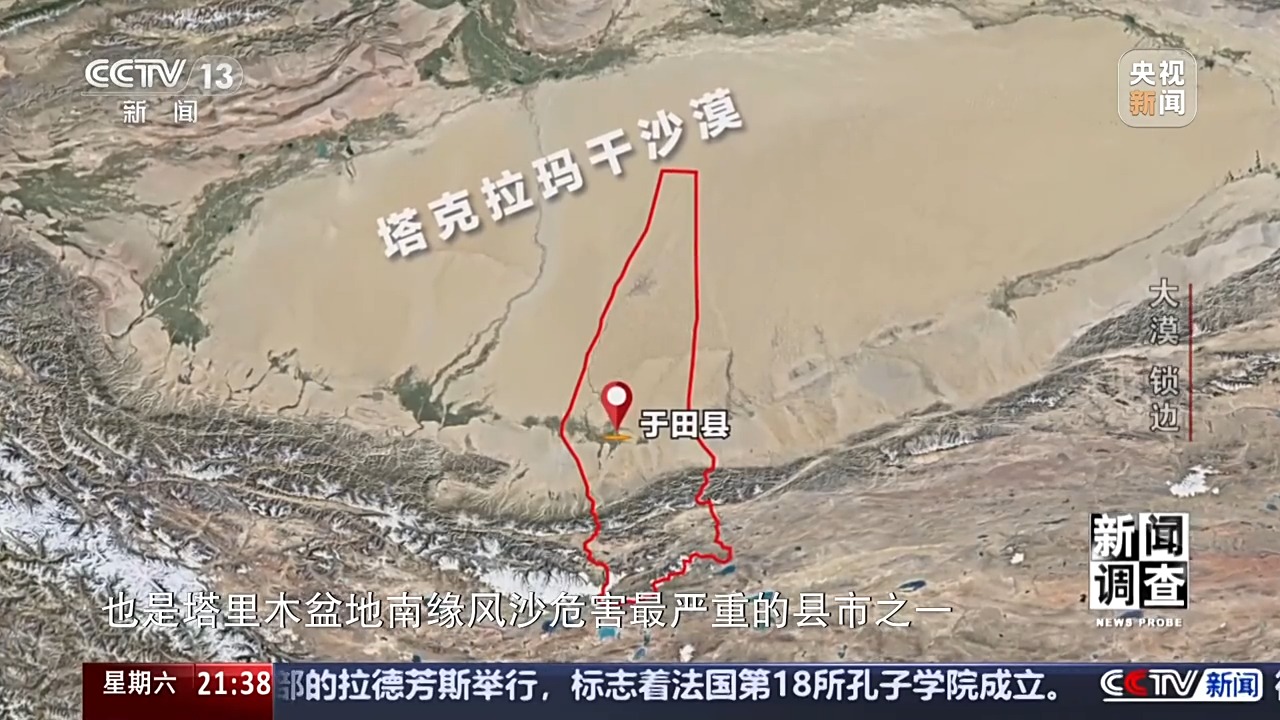 中國科學(xué)院新疆生態(tài)與地理研究所荒漠與綠洲生態(tài)國家重點實驗室主任 陳亞寧:整個塔克拉瑪干沙漠邊緣的周長3046公里,那其中有285公里空白區(qū)需要鎖邊。在這285公里中,和田地區(qū)就有220公里,那為什么這么多年防沙治沙生態(tài)建設(shè)都沒有做完,為什么還剩下這285公里呢?因為這285公里的空白區(qū)大多位于這個風(fēng)線、風(fēng)口、風(fēng)沙路徑區(qū),治沙難度非常大,而且水資源也匱乏,所以在這一塊地區(qū)這個鎖邊難度是非常之大的。