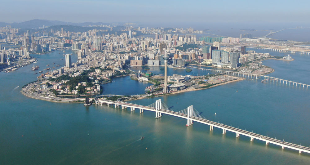 站在澳門新城A區(qū)眺望,毗鄰港珠澳大橋,一座嶄新的橋梁——澳門大橋在澳氹海面上騰空而起。