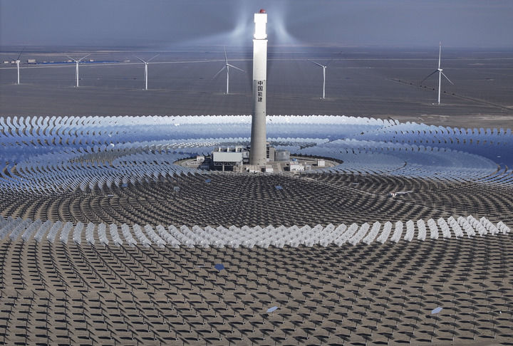 這是2024年9月12日在新疆哈密市伊吾縣淖毛湖鎮(zhèn)拍攝的國(guó)家光熱示范項(xiàng)目——熔鹽塔式50兆瓦光熱發(fā)電站(無(wú)人機(jī)照片)。 新華社記者 胡虎虎 攝
