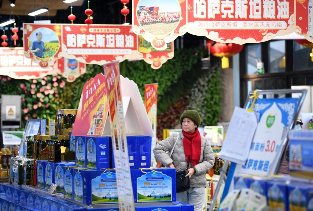消費者在“中歐班列(西安)進(jìn)口商品年貨節(jié)”上挑選哈薩克斯坦糧油產(chǎn)品(2024年2月1日攝)。 新華社記者 李一博 攝