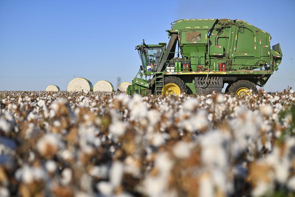 9月29日,采棉機在新疆生產(chǎn)建設(shè)兵團第六師五家渠市的棉田采收棉花。新華社記者胡虎虎 攝