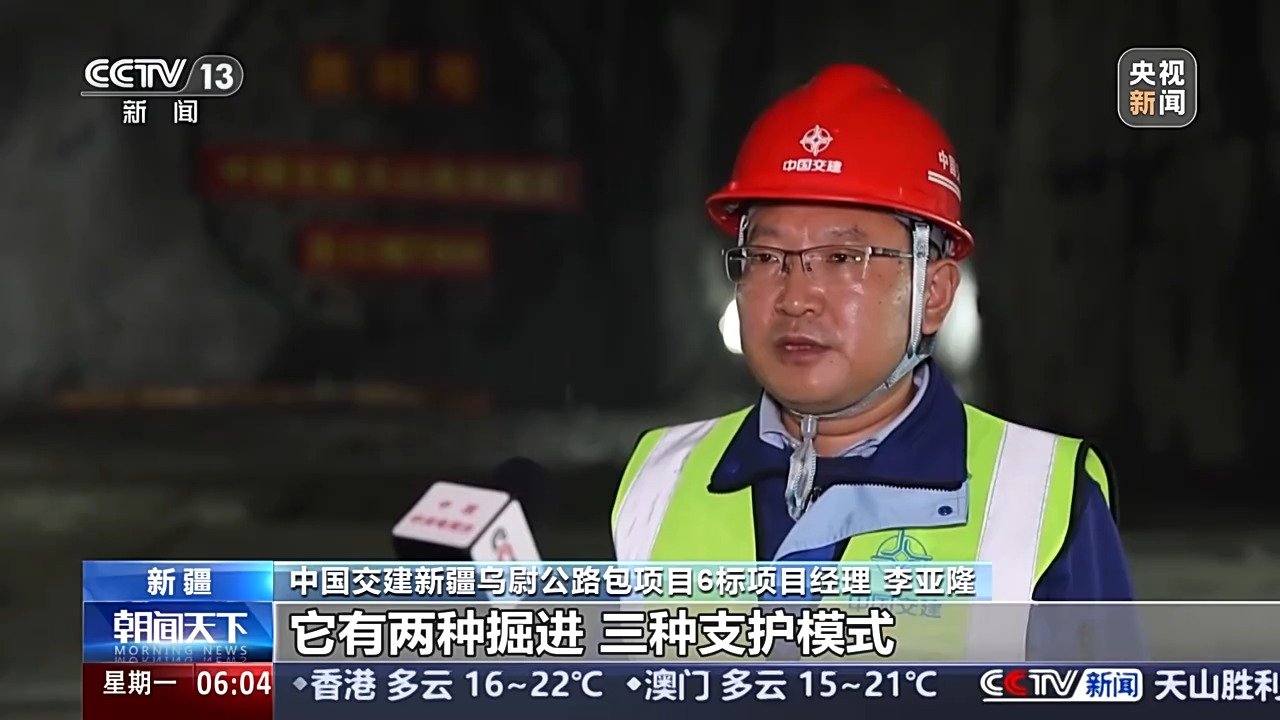 中國交建新疆烏尉公路包項目6標項目經理 李亞隆:這是我國自主研制的新型硬巖掘進機,它有兩種掘進、三種支護模式,整合了多項功能,可以根據軟硬不同的地層隨時調整掘進和支護模式。掘進中能直接加固好隧道內壁,比人工鉆爆快5倍。