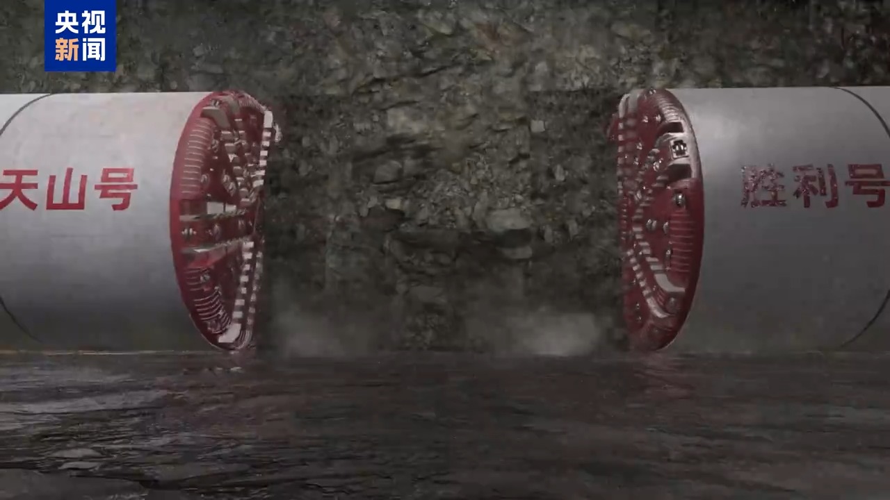 中導洞里,這兩個分別長283米、刀盤直徑接近3層樓房高、重量約2000噸的鋼鐵“巨無霸”是為中導洞的快速掘進專門“量身定制”的利器。名叫“天山號”和“勝利號”的兩臺硬巖掘進機分別從隧道兩端向中間掘進。