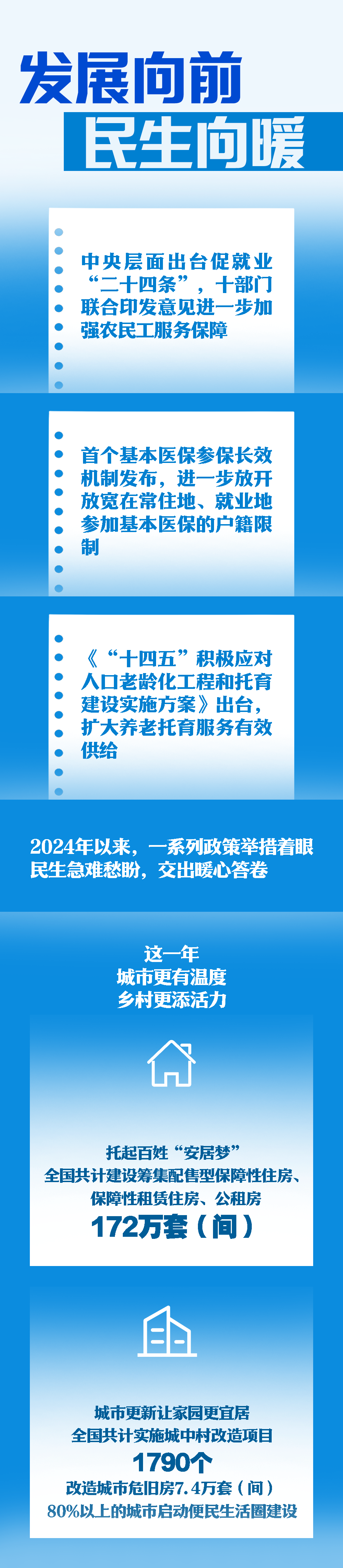 2024年以來,從中央層面出臺促就業(yè)“二十四條”,到首個(gè)基本醫(yī)保參保長效機(jī)制發(fā)布,再到聚焦“一老一小”領(lǐng)域擴(kuò)大養(yǎng)老托育服務(wù)有效供給,一系列政策舉措著眼民生急難愁盼,書寫暖心答卷。