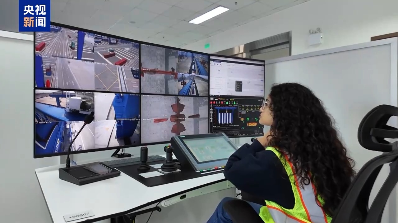 在遠程操作區(qū),我們看到,通過電腦控制系統(tǒng)即可實現(xiàn)港口裝卸的全自動化操作。員工無需再攀上高高的吊機,只需坐在控制臺前,通過多角度實時監(jiān)控屏和搖桿手柄,便能精確完成數(shù)百噸甚至上千噸集裝箱的裝卸任務。
