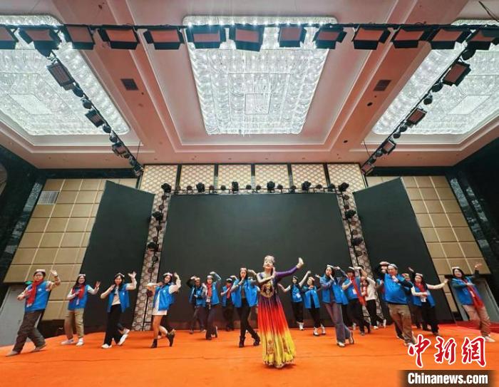 圖為參加交流團的香港青年(藍衣)跟隨當(dāng)?shù)孛癖妼W(xué)習(xí)新疆特色舞蹈?!≈鬓k方 供圖