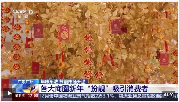 在廣州各大商圈,歡喜過(guò)大年的喜慶裝扮陸續(xù)煥新,有的擺上紅紅火火的“金錢樹(shù)”,有的在商場(chǎng)內(nèi)設(shè)立各種展覽,增加消費(fèi)者購(gòu)物樂(lè)趣和文化體驗(yàn)?! ?