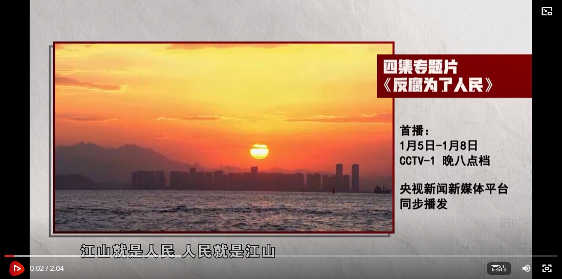 由中央紀(jì)委國家監(jiān)委宣傳部與中央廣播電視總臺聯(lián)合攝制的四集電視專題片《反腐 為了人民》,將于1月5日至8日在中央廣播電視總臺央視綜合頻道晚8點(diǎn)檔播出。