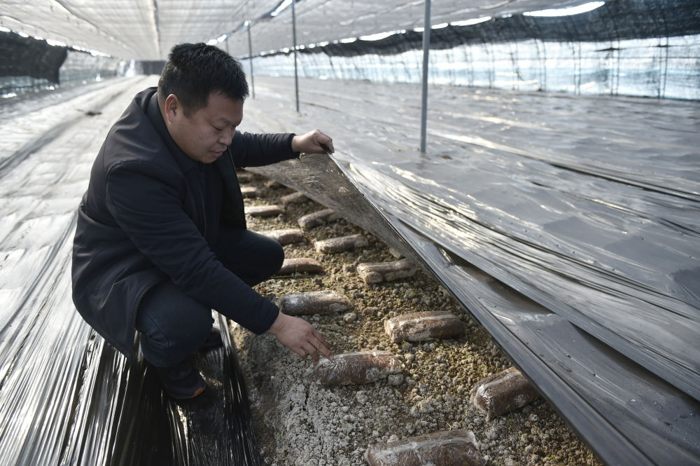 2024年1月11日,村民在河南省寶豐縣周莊珍稀菌產(chǎn)業(yè)園的羊肚菌種植大棚內(nèi)查看生長情況。周莊珍稀菌產(chǎn)業(yè)園按照“企業(yè)+合作社+農(nóng)戶”的運(yùn)營模式,積極發(fā)展鄉(xiāng)村特色種植產(chǎn)業(yè)。新華社記者 魯鵬 攝