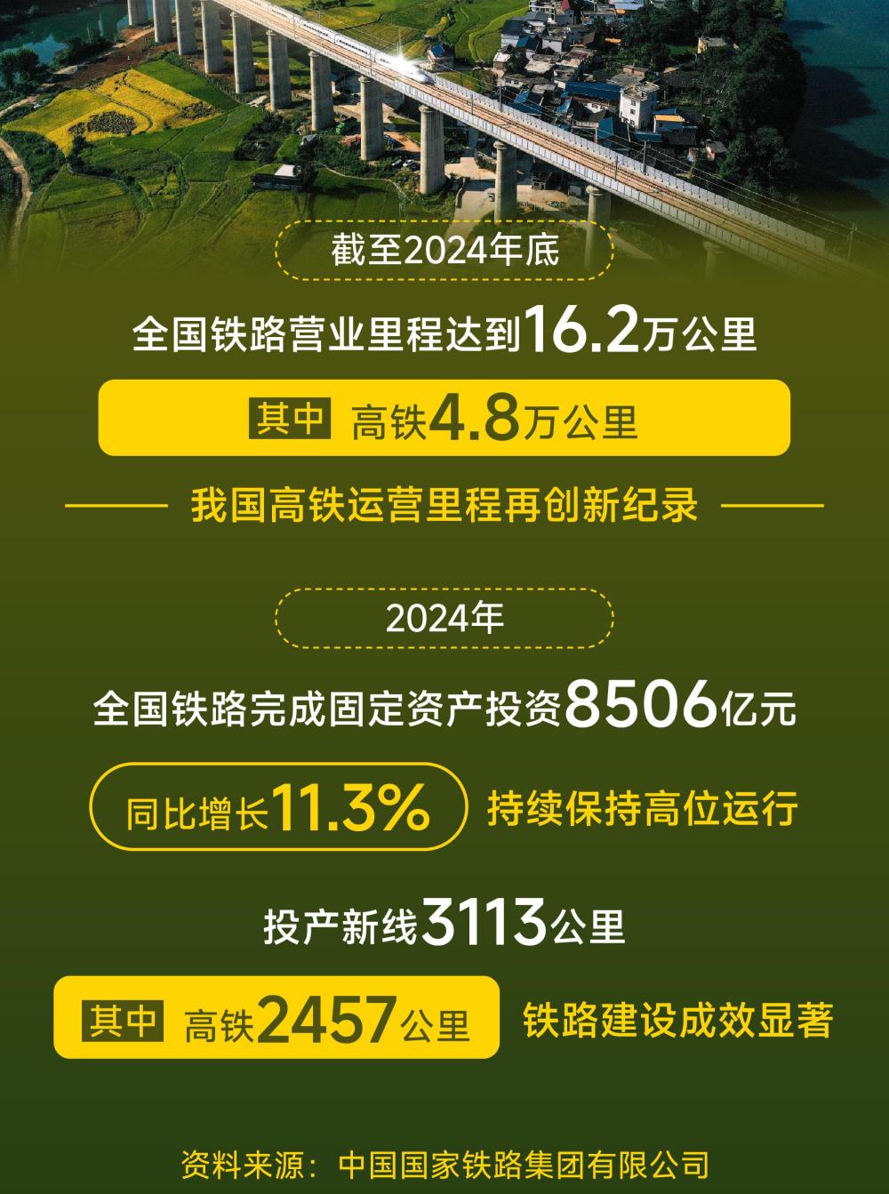 截至2024年底,全國鐵路營業(yè)里程達到16.2萬公里,其中高鐵4.8萬公里,我國高鐵運營里程再創(chuàng)新紀錄。