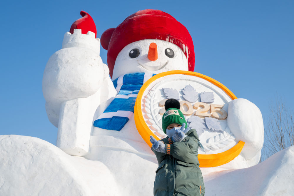 1月3日,在哈爾濱冰雪大世界園區(qū),游客與亞冬會(huì)吉祥物雪雕“濱濱”合影。
