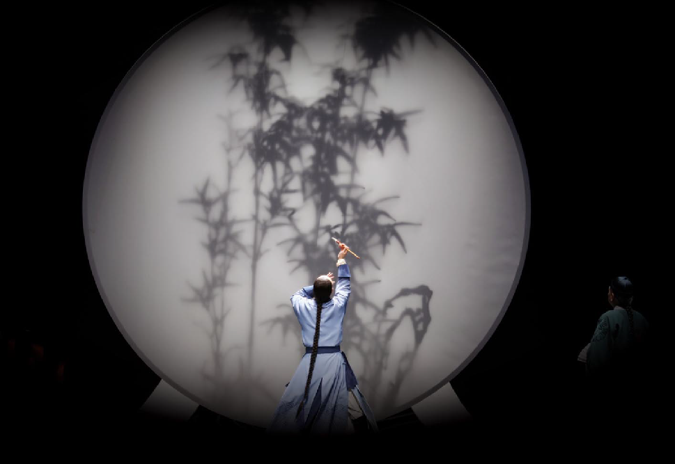 舞臺上,古琴與琵琶的悠揚旋律仿若一陣清風(fēng),輕輕拂開歷史的畫卷,清代揚州的風(fēng)情萬種如詩如畫般徐徐展開。鄭板橋筆下的竹、蘭、石化作他性格的三種特質(zhì),生動地展現(xiàn)了為官之德、書生之質(zhì)、為民之心,以及他對生命價值的執(zhí)著堅守,深深地震撼著每一位觀者的心靈,讓他們沉浸其中,心潮澎湃。
