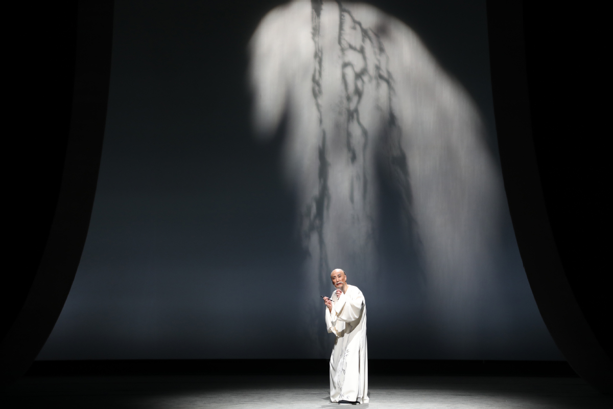 劇場里,舞臺的空間設(shè)計為觀眾提供深刻的審美體驗。舞臺既保留了傳統(tǒng)戲曲“一桌二椅”的簡約美學(xué),又緊扣揚州園林特征,運用黑白對比色調(diào)和光影變幻,隱喻鄭板橋內(nèi)心澄澈與光明,使其性格直觀生動地傳達(dá)給觀眾,讓物理空間成為精神外延。