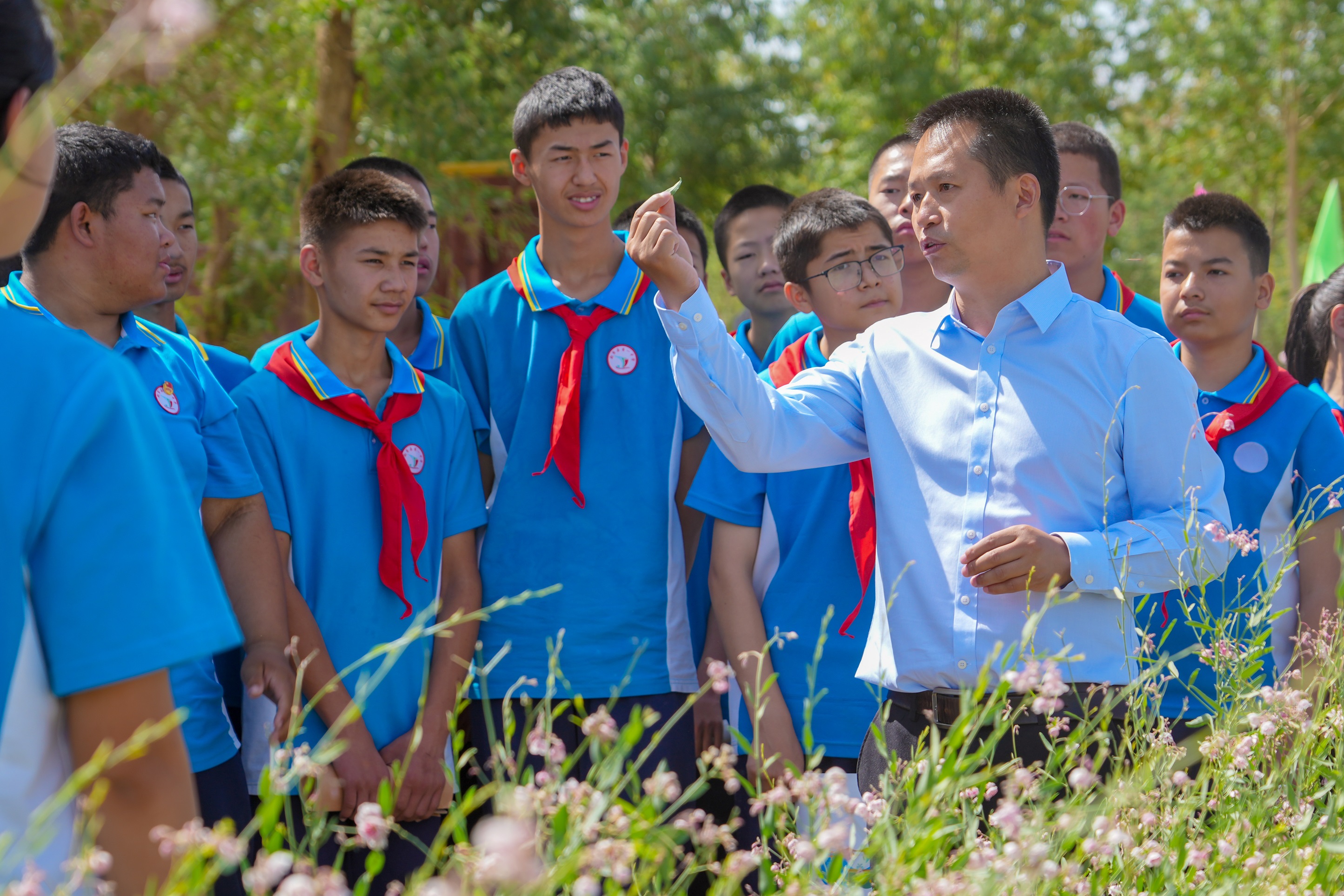 學(xué)生們?cè)谖纠缈h羅布麻種植基地參觀。奧瓊 攝