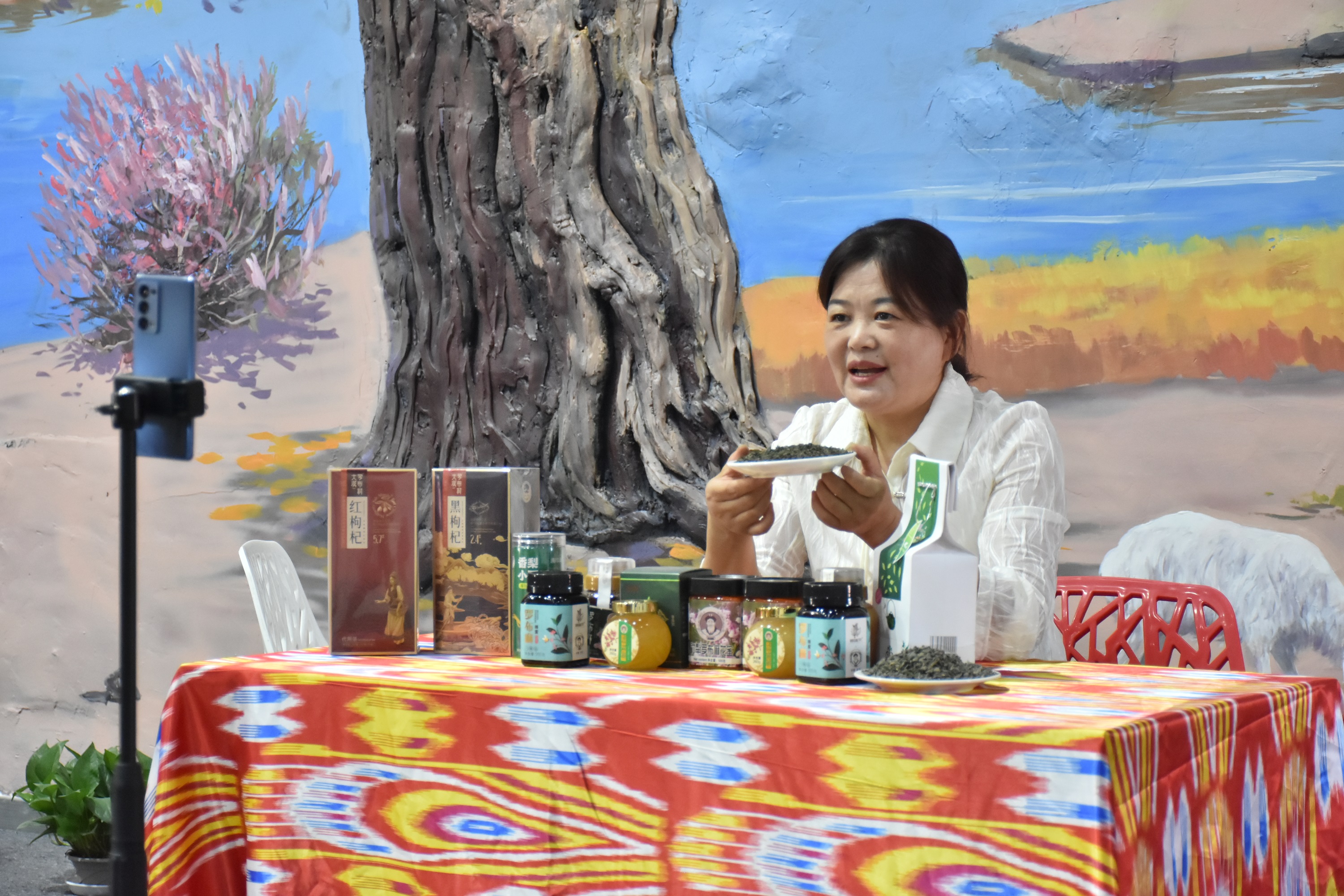 因?yàn)殡娚贪l(fā)展而受益的不只王曉紅。羅布麻茶、羅布麻蜜、尉犁小油馕、庫爾勒香梨、若羌紅棗、昆侖雪菊……走進(jìn)總面積近3000平方米的尉犁縣電商直播基地,100多種優(yōu)質(zhì)農(nóng)特產(chǎn)品整齊排列,不少主播正在直播。