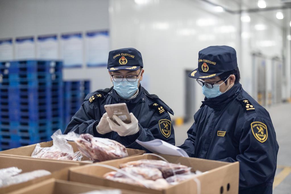 1月17日,在重慶國際物流樞紐園區(qū),重慶海關(guān)所屬渝州海關(guān)監(jiān)管科副科長劉議凡(左)與同事正仔細(xì)查驗通過中歐班列進(jìn)口的牛肉。新華社記者 黃偉 攝