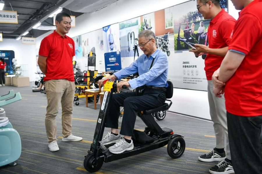 2024年10月12日,一名老人在體驗折疊電動代步車。位于深圳的老年用品商場“深業(yè)·健康匯”向市民開放,展示居家安全、娛樂生活、智能照護等50余個品類、數(shù)百種智能居家適老產(chǎn)品,吸引眾多市民前來了解、選購。新華社記者梁旭 攝