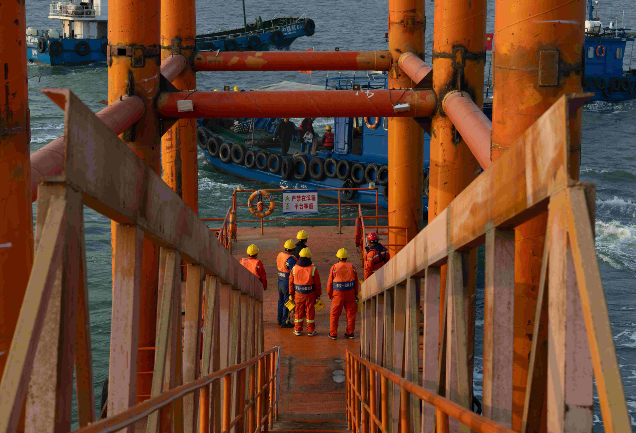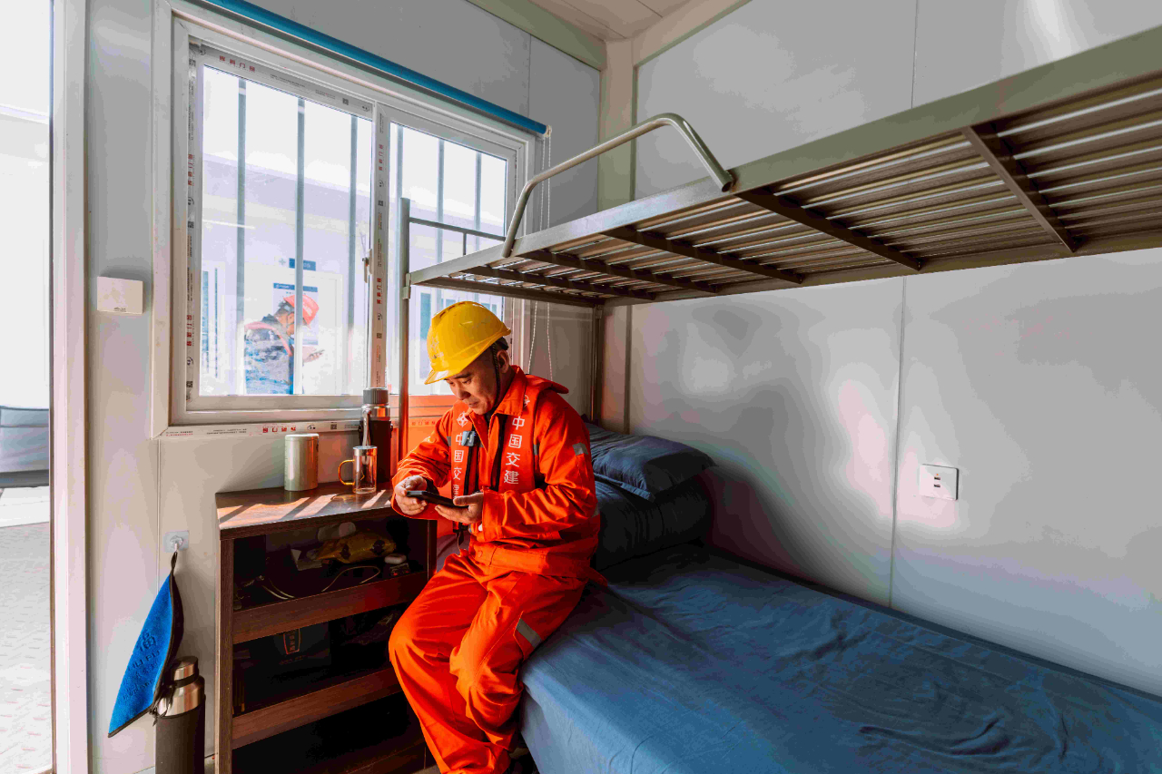梁芝敬和工友們工作的位置在離岸2海里的海上。一座總面積5萬(wàn)多平方米的海上平臺(tái),構(gòu)成了建設(shè)者們生活和工作的海上空間。工人們加班建設(shè)的劉五店航道橋,是廈金大橋(廈門段)關(guān)鍵控制性工程,全長(zhǎng)1948米,是福建省內(nèi)最大跨徑橋梁,也是福建省首座全離岸式海中懸索橋。春節(jié)前,項(xiàng)目部要完成沉井系梁6000方以及主塔套箱6640方封底混凝土澆筑任務(wù)。為此,梁芝敬和工友們需要不間斷倒班作業(yè),以保障工程任務(wù)能夠如期完成。而記者采訪時(shí),距離梁芝敬上一次離開海上平臺(tái),已經(jīng)過(guò)去57天。