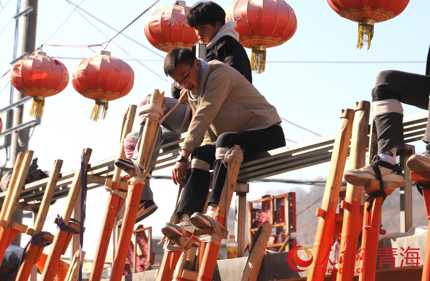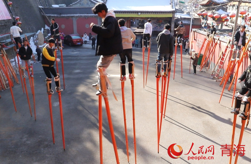 綁蹺、試蹺、定蹺……青海省西寧市湟中區(qū)魯沙爾鎮(zhèn)火神廟,魯沙爾高蹺隊(duì)迎來了春節(jié)前最后一次排練?!皬呐D月初一到現(xiàn)在二十多天了,今年大家積極性很高,報(bào)名的人也多,排練效果不錯(cuò)。”做好準(zhǔn)備,隨著社火音樂的鼓點(diǎn)舞動(dòng)起來,魯沙爾鎮(zhèn)高蹺協(xié)會會長李玉龍站在臺階上看著排練隊(duì)形。