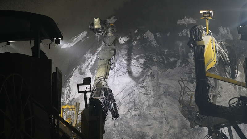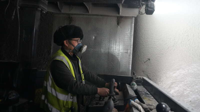 G219線昭溫公路(昭蘇至溫宿)西天山特長隧道內(nèi),施工員操縱機器作業(yè)。中青報·中青網(wǎng)記者 陳曉/攝