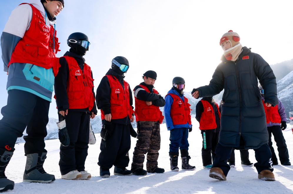 在新疆白云國際滑雪場,許秀娟(右一)在為新聘的雪場教練做培訓(xùn)。新華社記者 王菲 攝