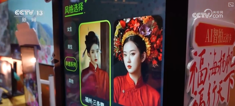 夜幕降臨,一場新春科技大秀在福州市的冶山春秋園上演了。泉州的簪花是福建文旅的頂流,在現(xiàn)場,一臺AI旅拍機(jī)吸引了許多游客排隊(duì)體驗(yàn)。只要拍攝一張照片,就可以利用AI一鍵生成“簪花圍”造型,還能輕松在各種非遺裝扮之間來回切換。