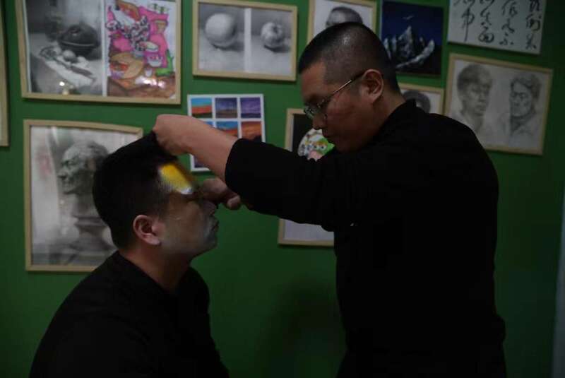 每次演出前,李曉濤要“擇臉”,決定哪張臉化哪個(gè)妝,臉大的演員有優(yōu)勢,承得下更復(fù)雜更多細(xì)節(jié)的妝容;額頭高的人可以畫上半張臉細(xì)節(jié)更多的“三塊瓦”。畫著同一底色的演員表演時(shí)不能站在一起,以免觀眾有重復(fù)的感覺。