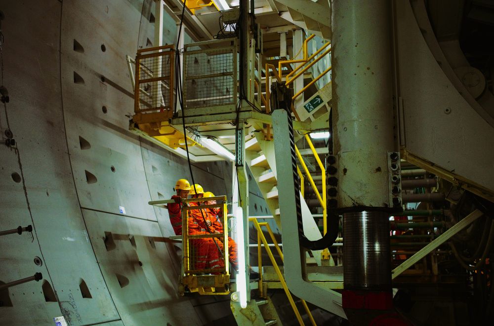走進這個黃河之下的“地底世界”,冷白色燈光如星輝般灑在隧道管片上,濃濃“水泥風”撲面而來。