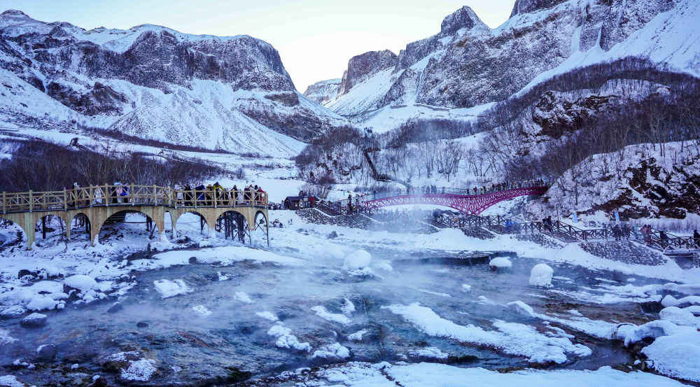 長(zhǎng)白山天池以北的延邊州,溫泉室外的樹枝上覆滿積雪,泡池內(nèi)滾燙的地?zé)嵩丛床粩?。伸出腳尖觸水,一股暖意傳遍全身。延邊云集安圖火山泉、龍井氟溫泉、延吉低氘溫泉等多種特色溫泉,吸引海內(nèi)外眾多游客慕名而來(lái)。