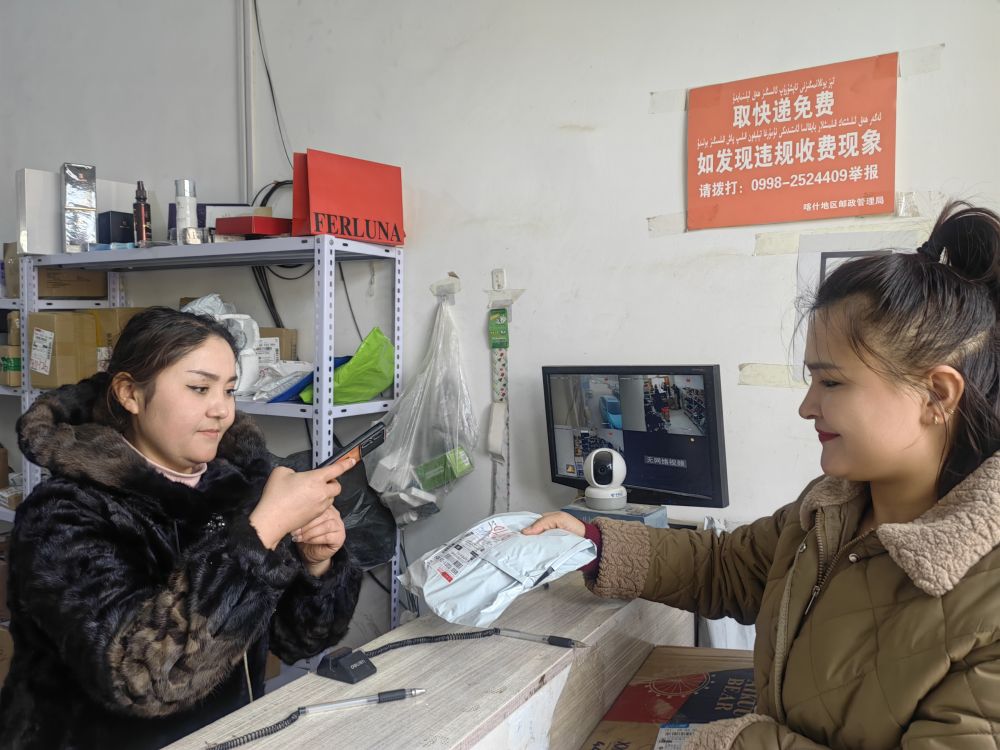 1月18日,在新疆喀什市荒地鄉(xiāng)一快遞代收點,負(fù)責(zé)人塔吉尼沙·買買提力(左一)在為顧客掃描快遞單號。新華社記者蔡國棟 攝