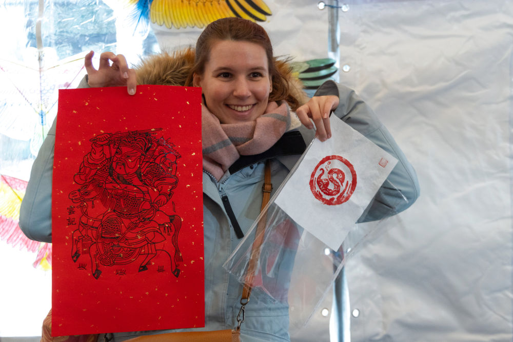 1月17日,在摩洛哥卡薩布蘭卡的“中國廟會(huì)”活動(dòng)現(xiàn)場,摩洛哥民眾展示印有中國農(nóng)歷蛇年主題圖案的木版水印作品。新華社記者霍晶攝