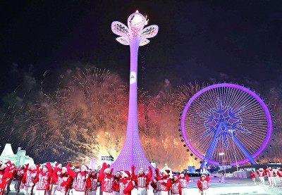 在《冰雪的亞細亞》的歡快樂曲聲中,來自34個國家和地區(qū)的體育代表團相繼入場,受到全場觀眾的熱情歡迎。哈爾濱,這座“冰雪之城”,用熱情撰寫了一部熱氣騰騰的迎賓志。