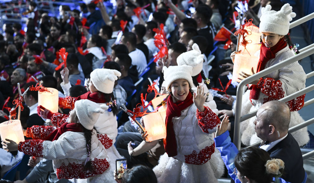 當(dāng)晚,在開(kāi)幕式分會(huì)場(chǎng)冰雪大世界,手提冰燈的孩子們來(lái)到占地百萬(wàn)平方米的園區(qū),與冠軍火炬手一同滑行,見(jiàn)證主火炬點(diǎn)燃。