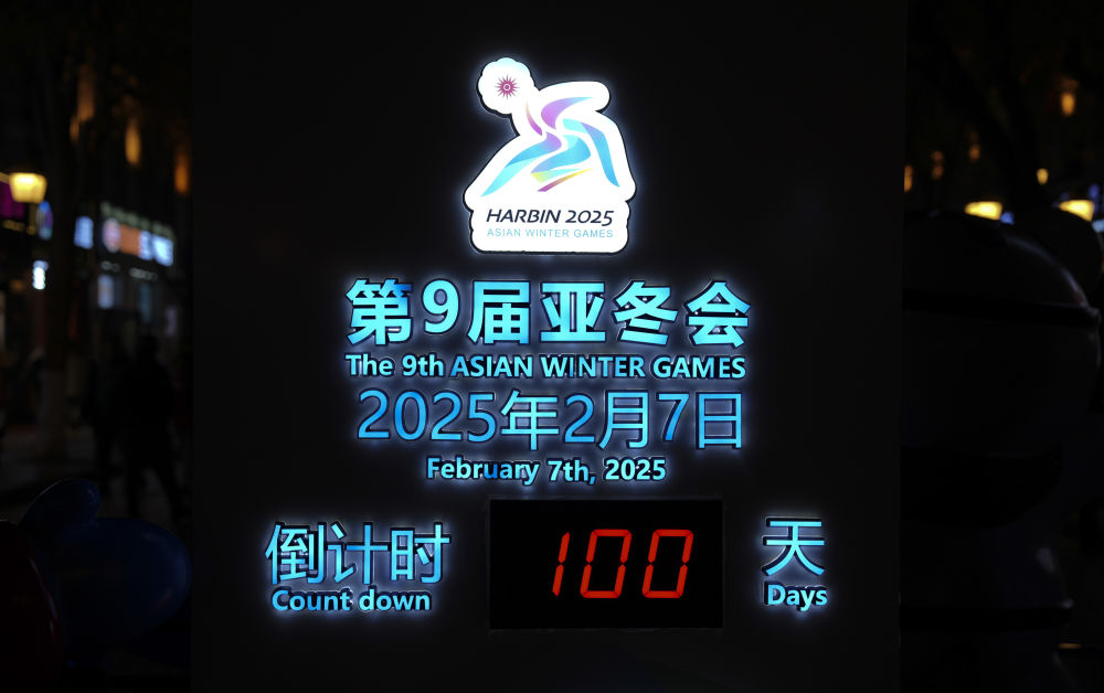 這是2024年10月30日在哈爾濱中央大街上拍攝的亞冬會倒計時牌。當(dāng)日是2025年第九屆亞洲冬季運(yùn)動會倒計時100天。