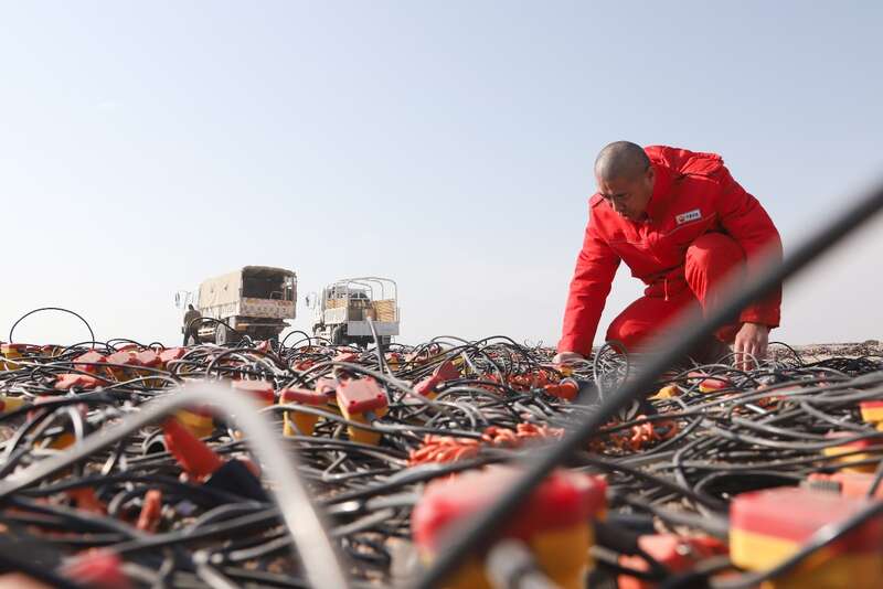 在施工現(xiàn)場(chǎng),需要檢測(cè)的無(wú)線節(jié)點(diǎn)儀器和檢波器串?dāng)[成了一個(gè)巨大的圓形圖案,李國(guó)忠和物探隊(duì)員一起為這些儀器做“健康體檢”。李國(guó)忠介紹,無(wú)線節(jié)點(diǎn)儀器穩(wěn)定性高、便于攜帶,主要用在高難山體區(qū)。在沙漠區(qū)采用高精度可控震源,既保證了施工質(zhì)量、提高了施工效率,也保護(hù)了生態(tài)環(huán)境,實(shí)現(xiàn)了綠色勘探。