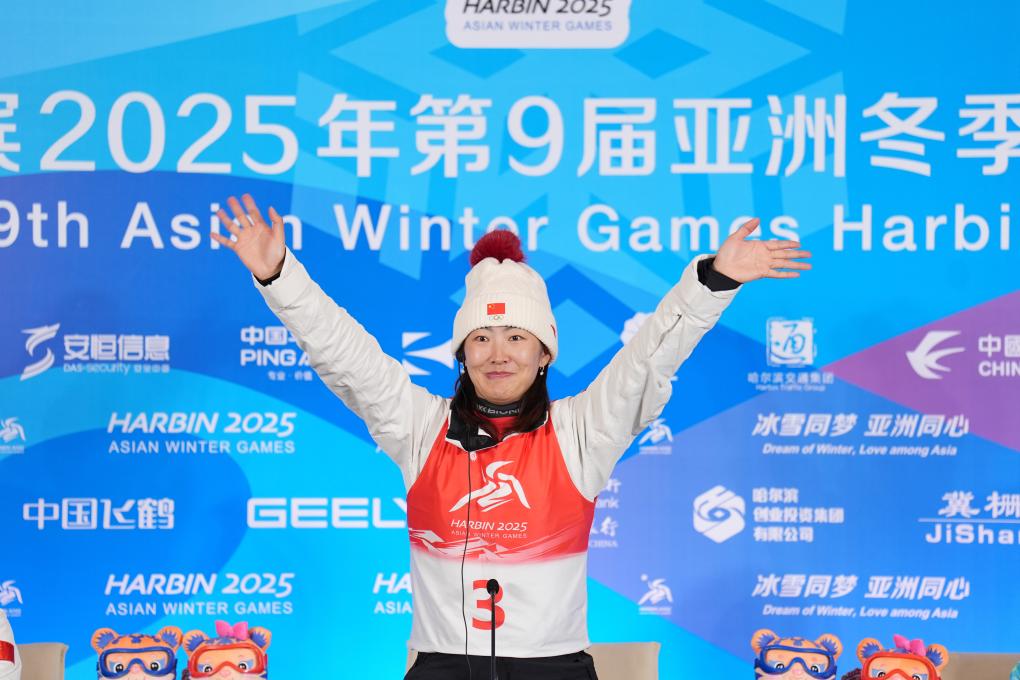 2月9日,中國(guó)選手徐夢(mèng)桃在發(fā)布會(huì)現(xiàn)場(chǎng)。當(dāng)日,第九屆亞冬會(huì)自由式滑雪女子個(gè)人空中技巧賽后新聞發(fā)布會(huì)在亞布力舉行。新華社記者 王松 攝