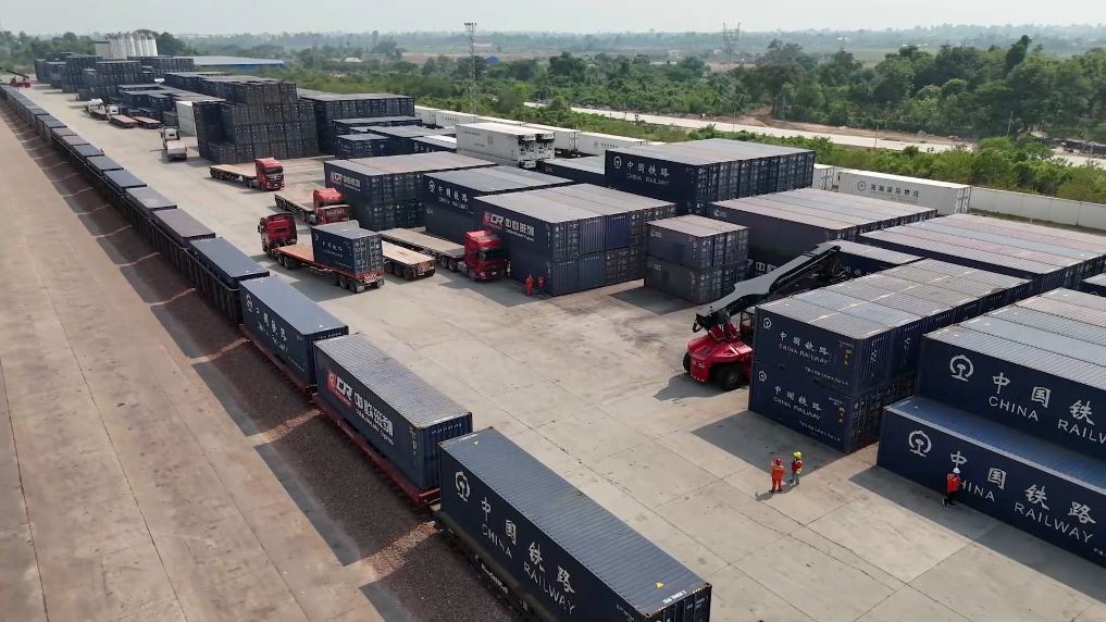 在中老鐵路萬象南站換裝場,一派繁忙而有序的景象映入眼簾。滿載泰國榴蓮、龍眼等貨物的集裝箱被穩(wěn)穩(wěn)吊裝上開往中國的中老鐵路“瀾湄快線”列車,裝有中國啤酒、藥膏等貨物的集裝箱則啟程前往泰國。