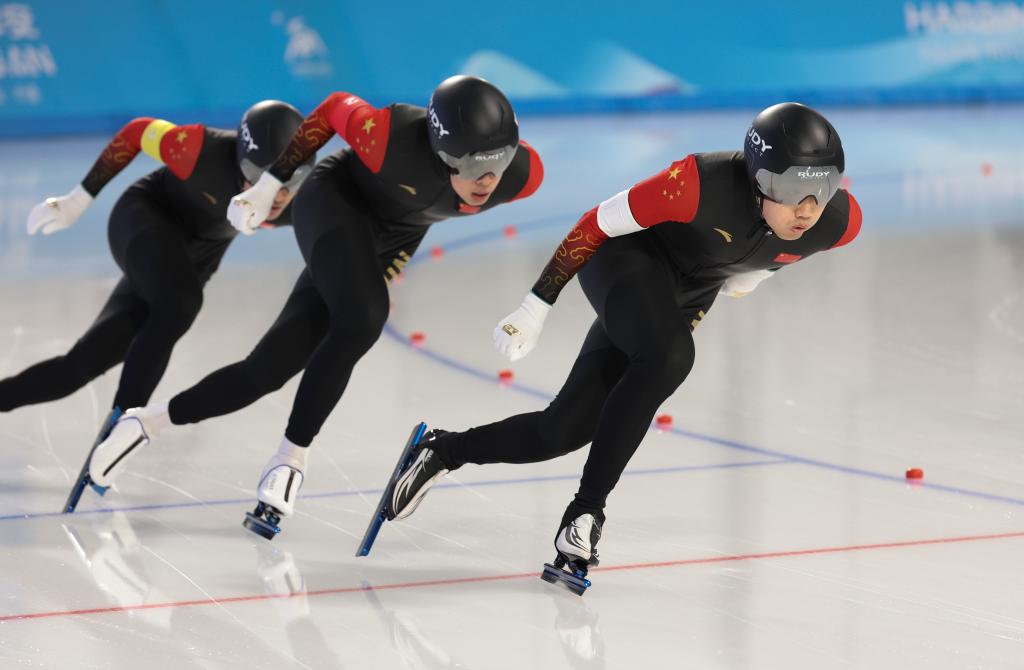 2月10日,中國隊(duì)選手高亭宇(右)、寧忠?guī)r、廉子文(中)在比賽中。當(dāng)日,第九屆亞冬會(huì)速度滑冰男子短距離團(tuán)體追逐賽在哈爾濱舉行。中國隊(duì)獲得冠軍。新華社記者 呂帥 攝