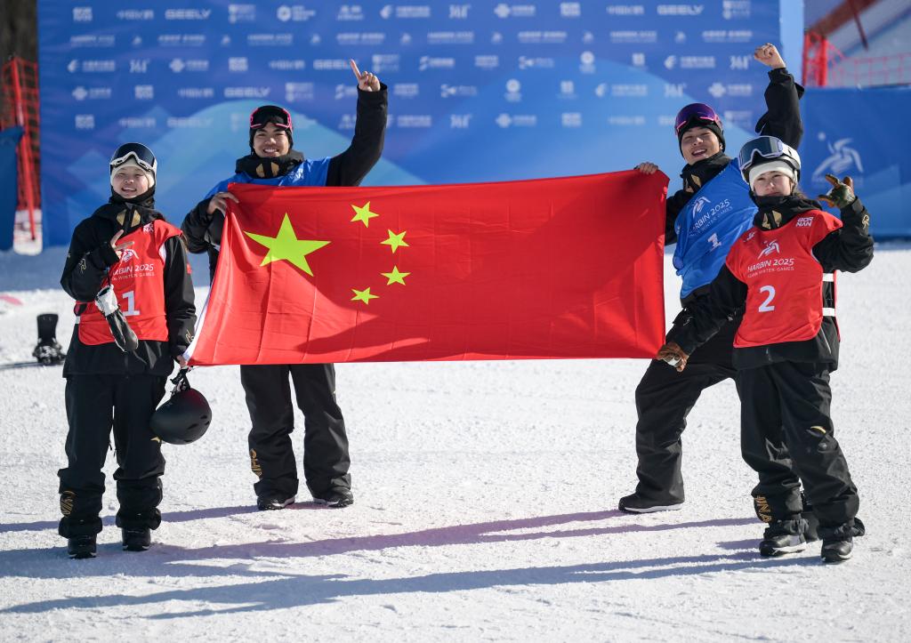 2月10日,中國選手張小楠、楊文龍、姜鑫杰與熊詩芮(從左至右)在比賽后慶祝。當(dāng)日,在亞布力舉行的第九屆亞冬會(huì)單板滑雪女子大跳臺(tái)決賽中,中國選手熊詩芮奪冠,張小楠獲得亞軍;在男子大跳臺(tái)決賽中,中國選手楊文龍奪冠,姜鑫杰獲得亞軍。新華社記者 牟宇 攝