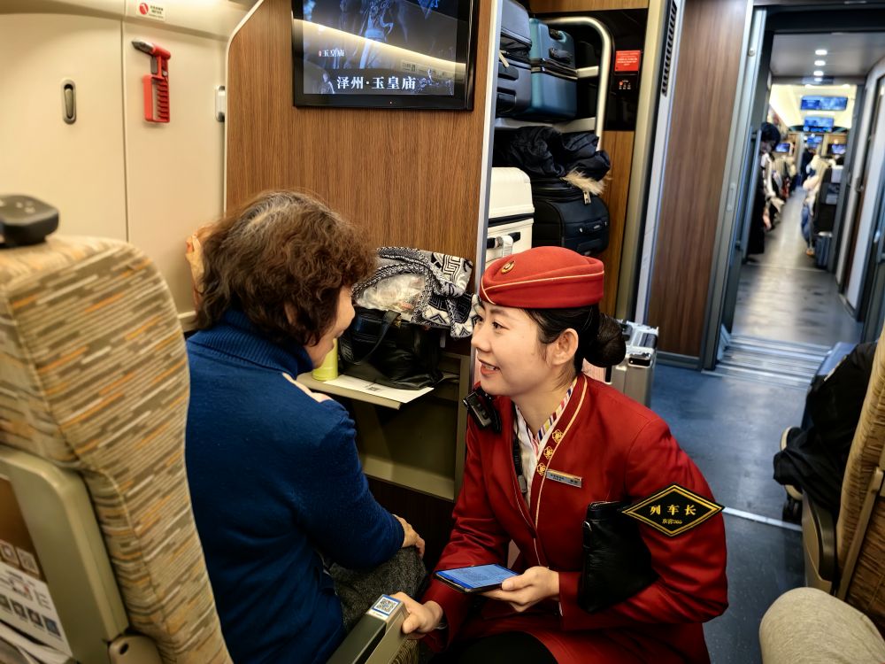 2025年1月25日,在北京開往上海的G9次列車上,列車長韓茹為一位獨(dú)自出行的老年旅客服務(wù)。新華社記者 翟翔 攝