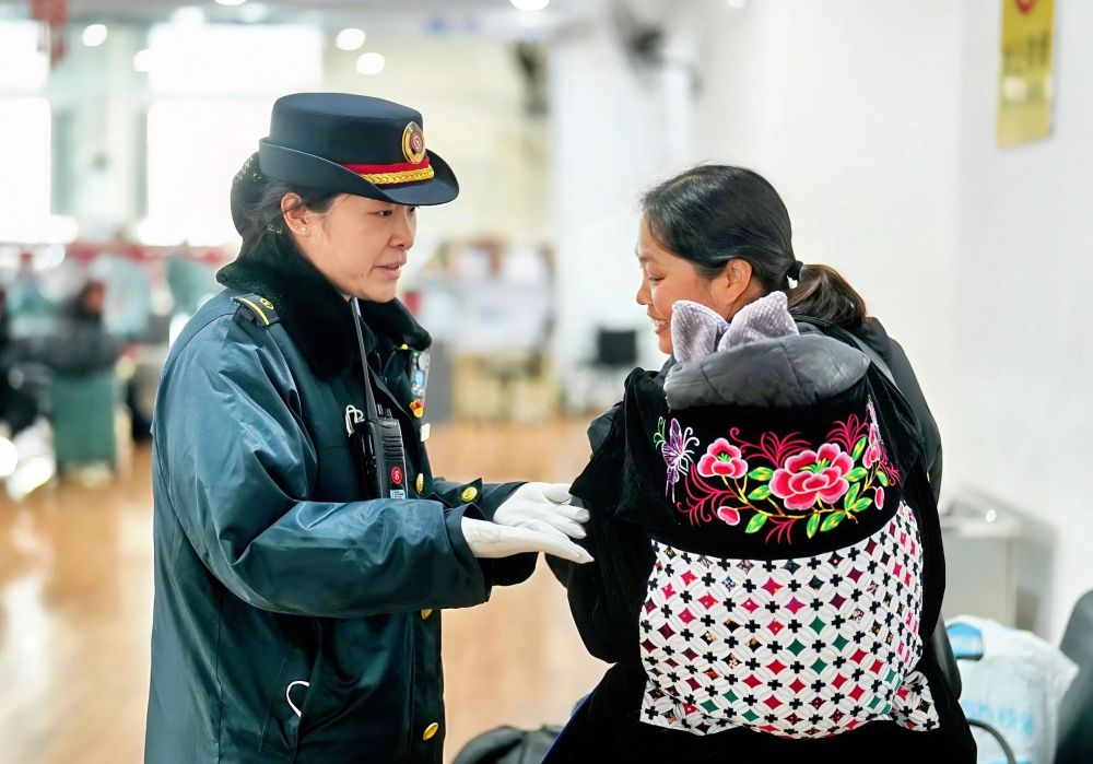 2025年1月29日,國鐵武漢局襄陽站客運(yùn)員穆佟在為旅客服務(wù)。新華社發(fā)(劉娟 攝)