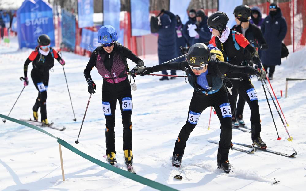 2月12日,次旦玉珍(前左)/布魯爾在比賽中交接棒。當(dāng)日,第九屆亞冬會滑雪登山混合接力決賽在亞布力舉行。中國組合次旦玉珍/布魯爾、于婧萱/畢禹新、索朗曲珍/劉建賓分別獲得冠、亞、季軍。新華社記者 謝劍飛 攝