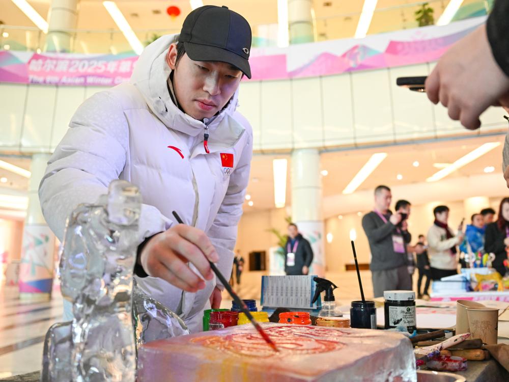 ↑在第九屆亞冬會運(yùn)動員村,中國代表團(tuán)的冰球運(yùn)動員張澤森在體驗拓彩冰雪畫。新華社記者 王曦 攝