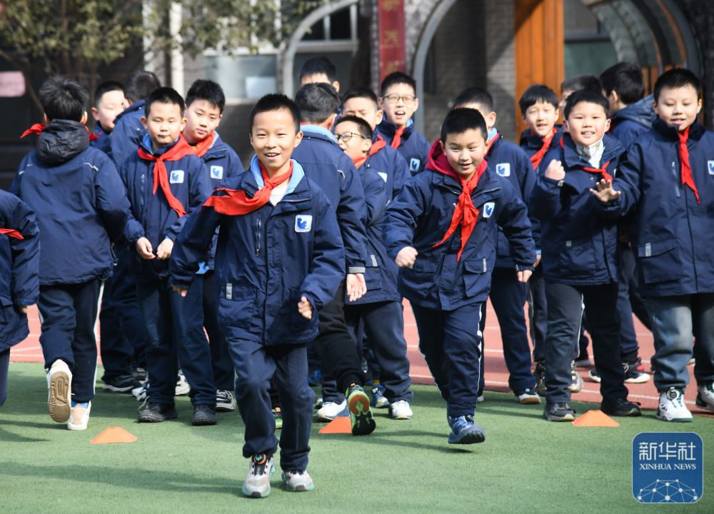 2月14日,西安市后宰門小學(xué)學(xué)生在體育課上進(jìn)行熱身活動(dòng)。新華社記者 張博文 攝