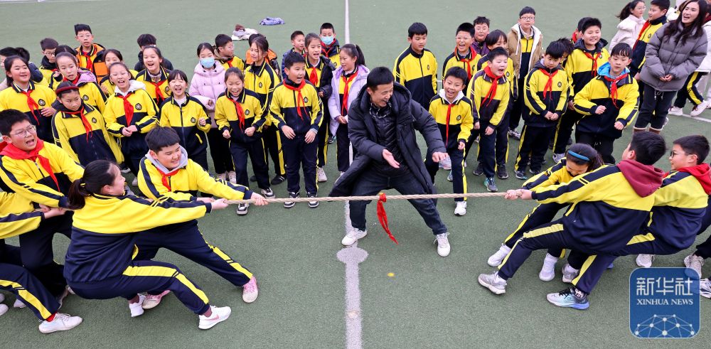 2月14日,合肥市園上園小學(xué)喻崗分校師生在開學(xué)典禮上進(jìn)行“貪吃蛇”接力跑活動(dòng)。新華社記者 周牧 攝